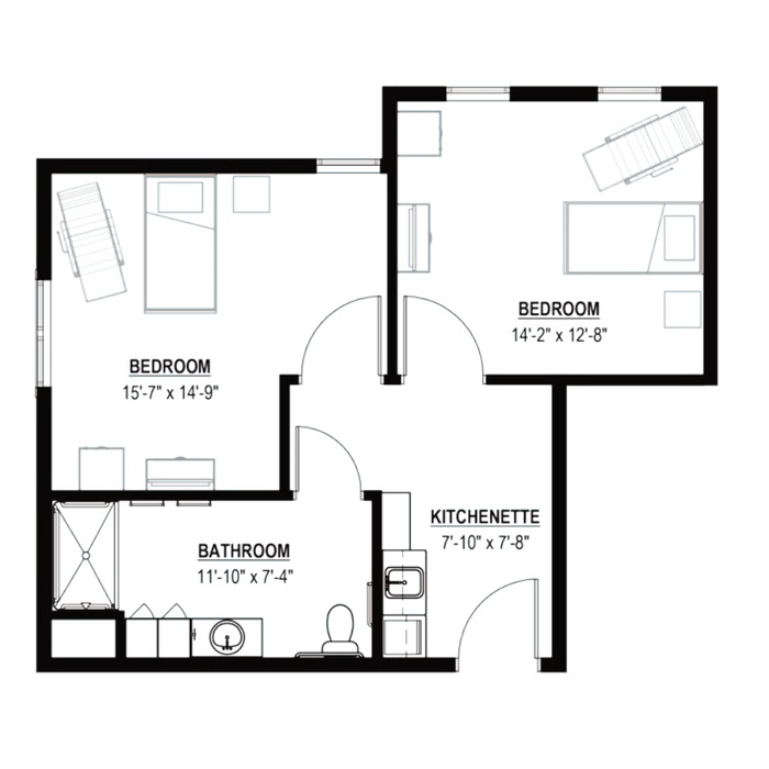 A sampling of suites floor plans · Bath with step-in shower · Kitchenette with refrigerator, microwave and sink